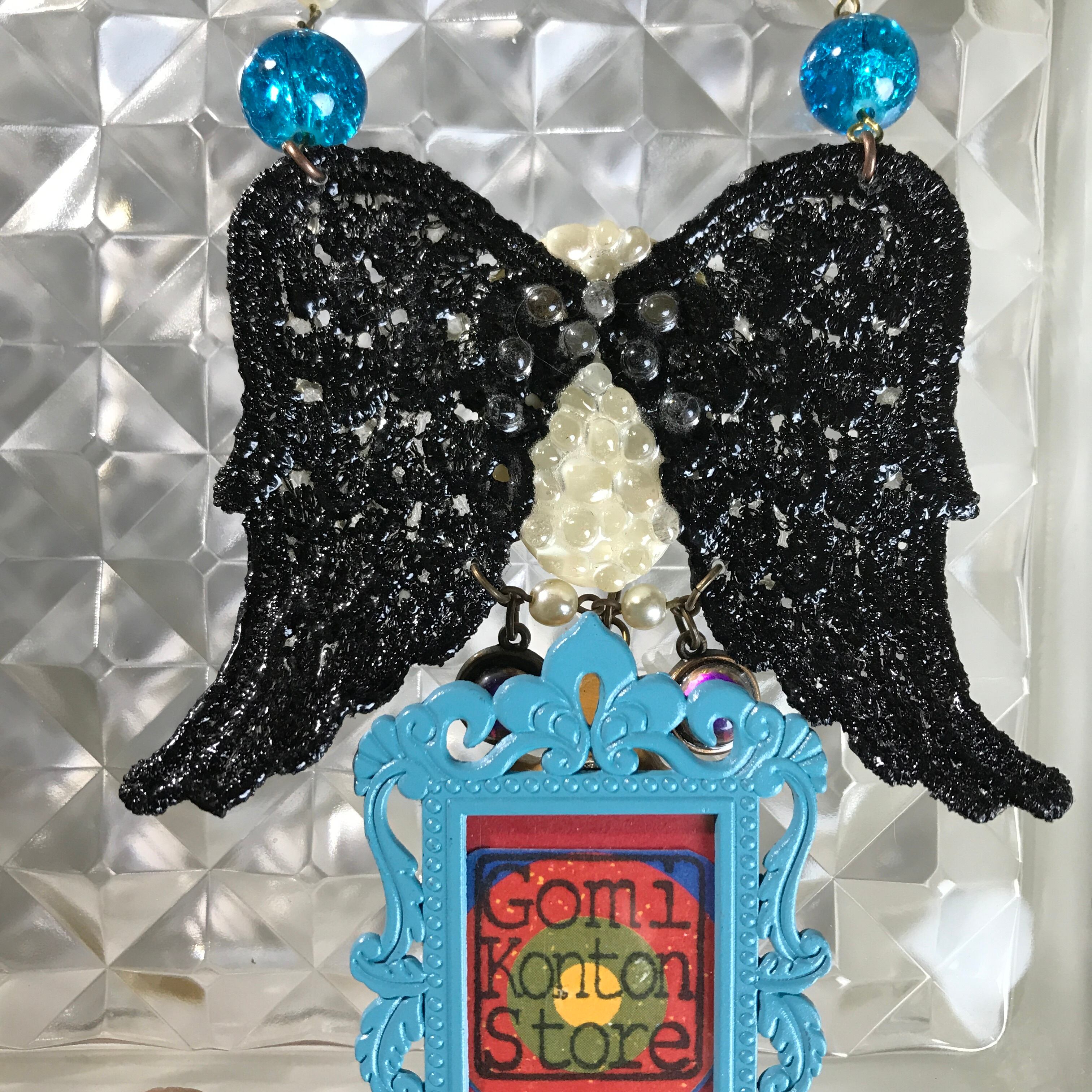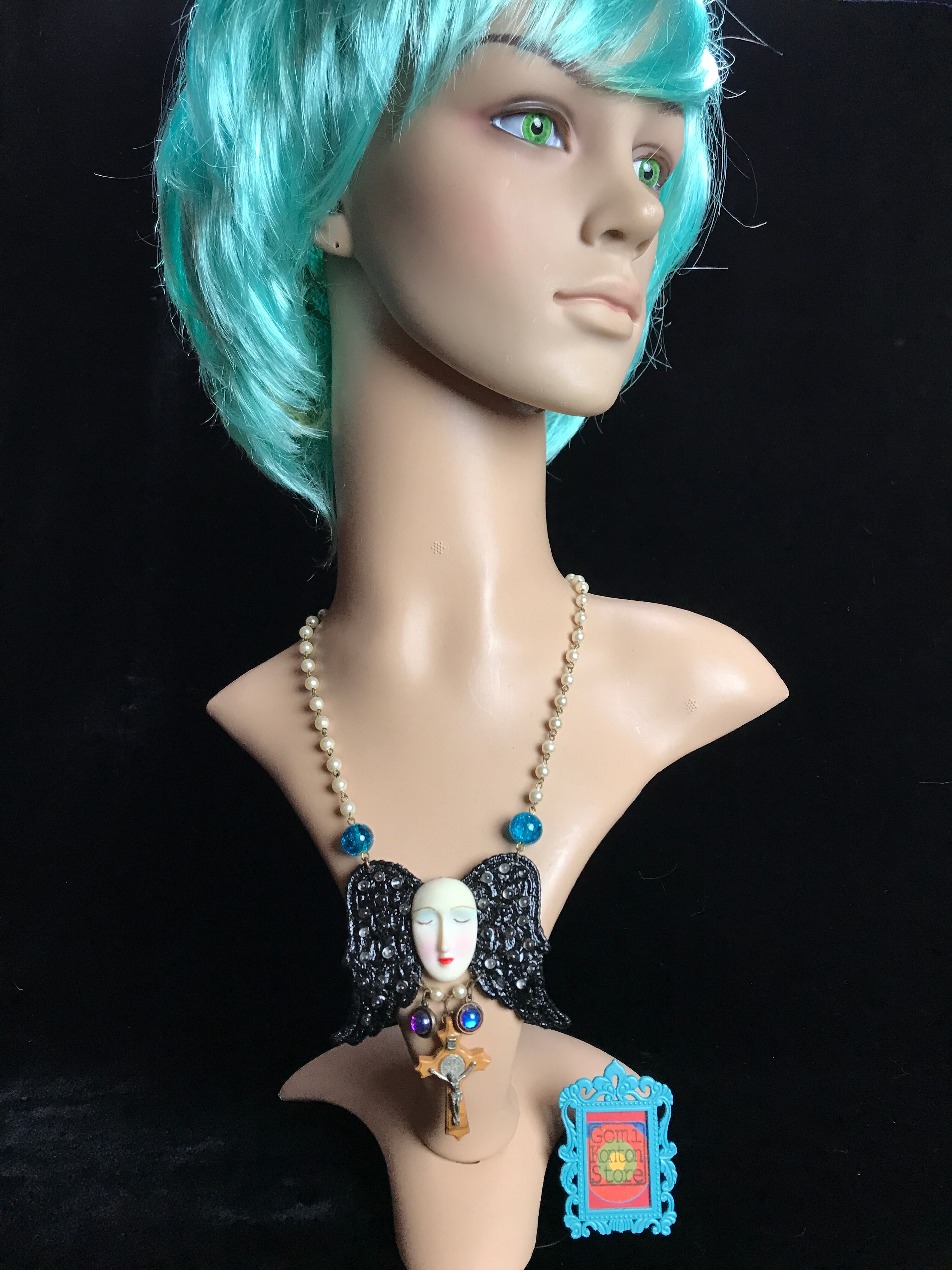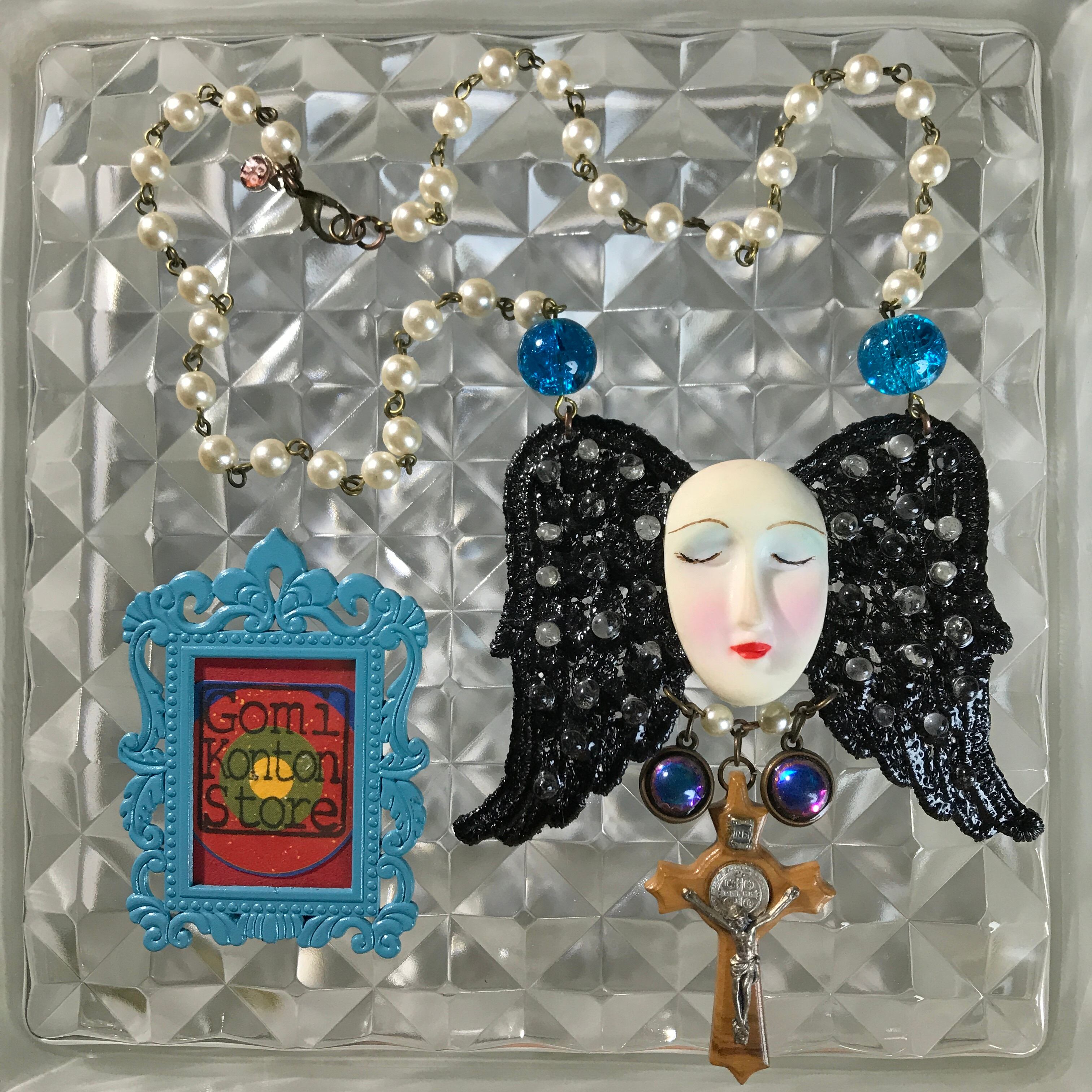 『おとぎ話に出てきそうな美しくも優しいお顔の天使のネックレスです。古く珍しいヴィンテージのお顔パーツを使用。金属と木製でできたイタリア製の十字架パーツもとても綺麗です。チェーン部分はクラシカルにパール風仕様にし、ネックレスの長さはつけやすくも綺麗に見える40㎝にしました。ブルー系のひび割れ風のガラスビーズとオーロラブルーのラインストーンが全体の美しさを引き出しています。全体的に軽量です。Gomiおすすめのネックレスです。』