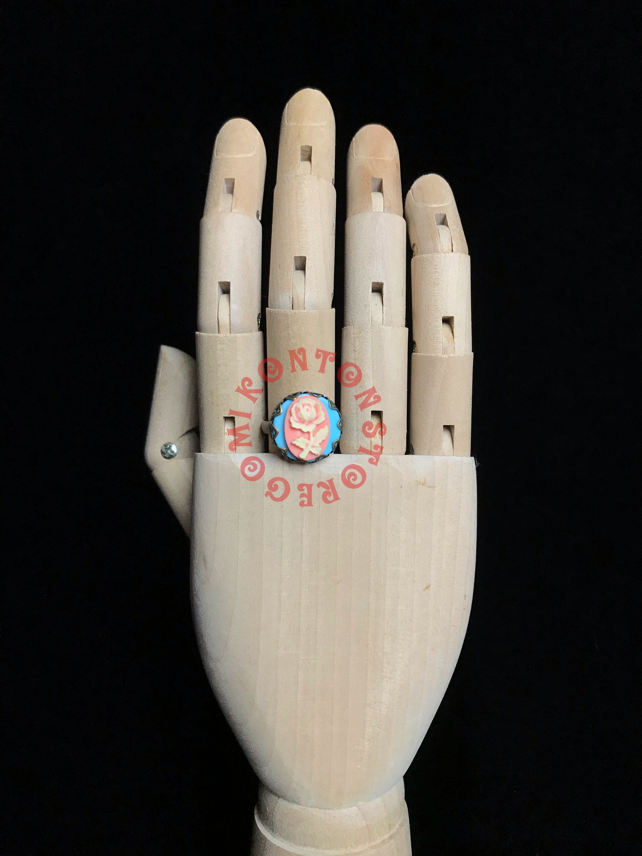 『クラシカルな雰囲気の薔薇のカメオとキッチュなボタンを組み合わせた可愛らしい指輪です。』