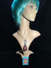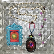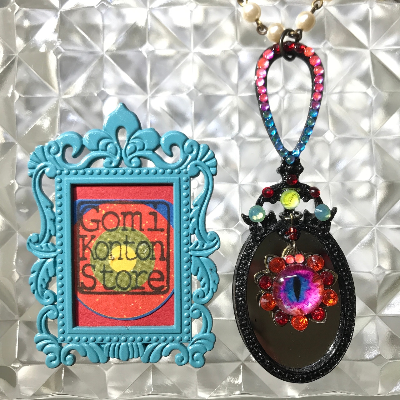 『ネオンカラーのラインストーンと鮮やかな眼が美しい鏡が主人公のネックレスです。ネックレス部分は上品なパールチェーンと可愛らしいカラーガラスビーズです。鏡は古いパーツを使用しているため経年美があります。ネックレスの長さも使いやすい50㎝サイズです。』